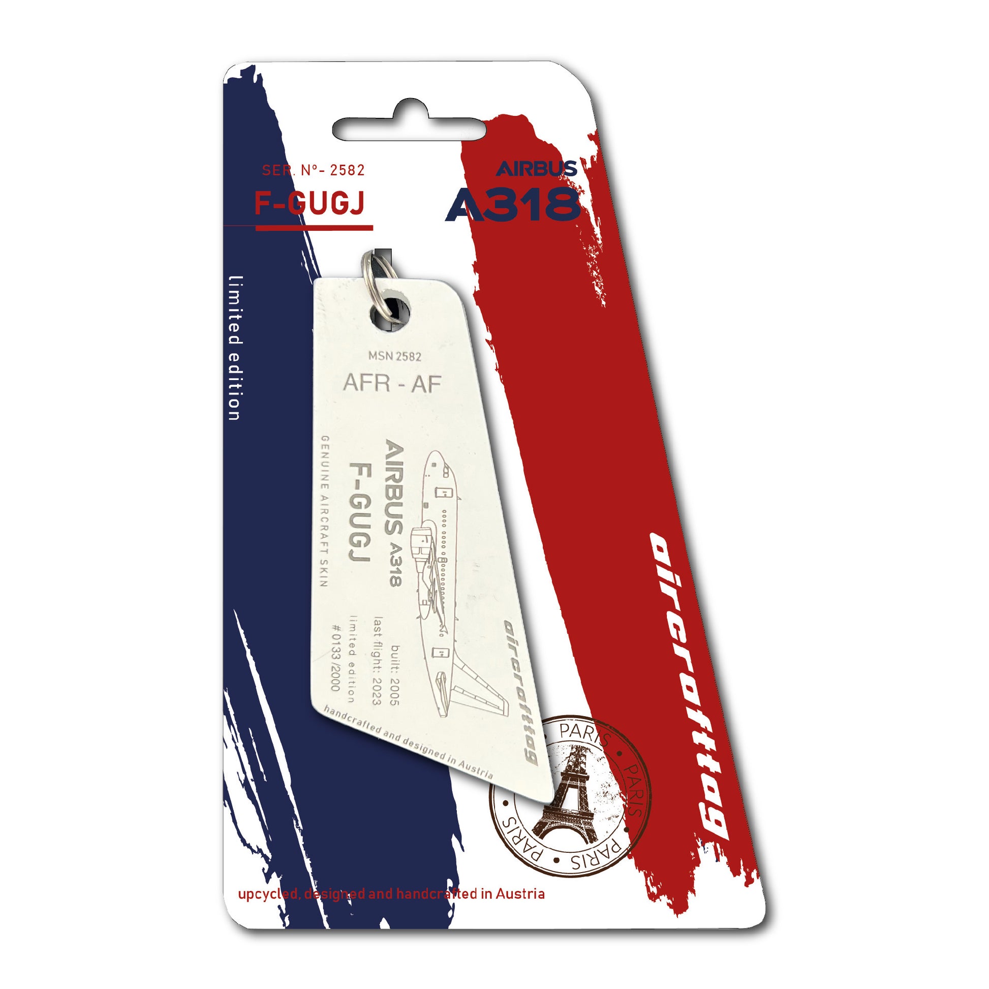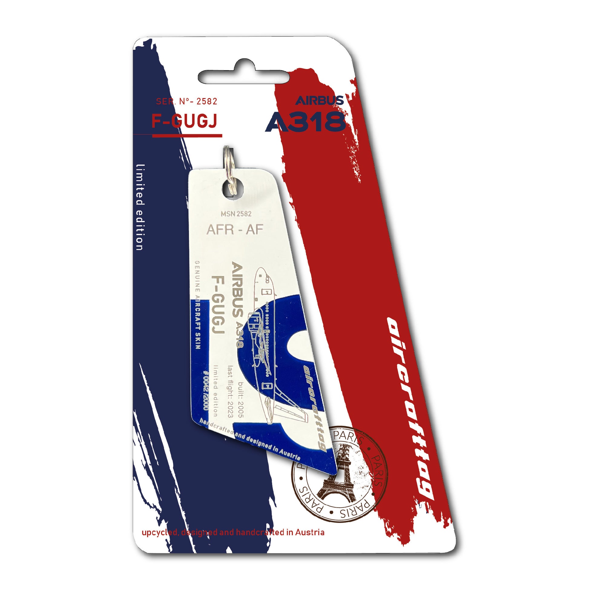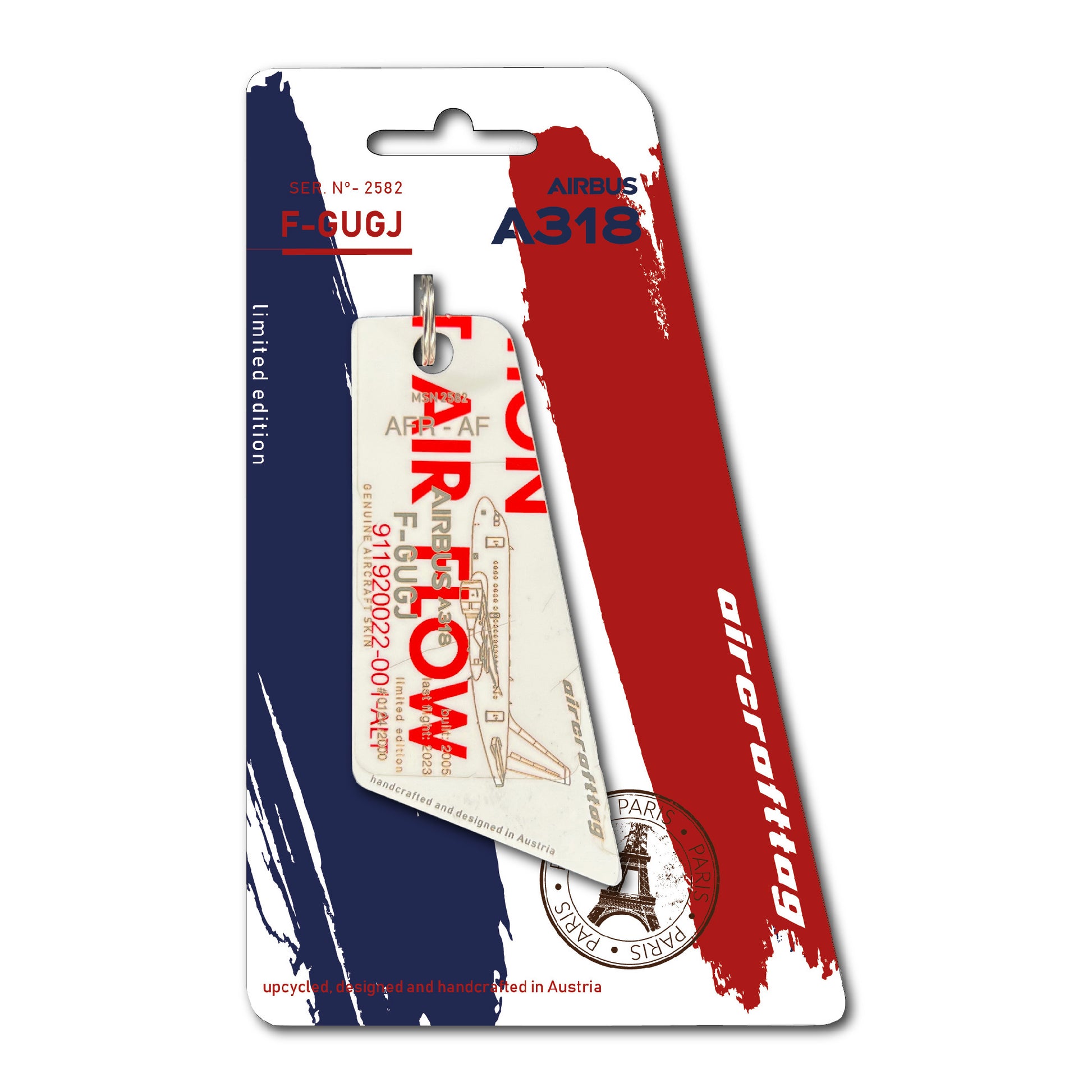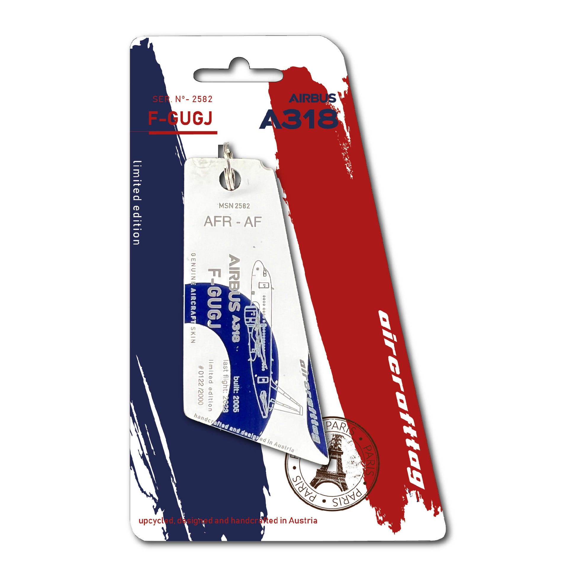 A special feature of the A318 were the small wings on the nosegear, also known as strakes. These were necessary because, in contrast to other Airbus models, the distance from the nose gear to the angel of attack sensors was smaller and the airflow would have disturbed the sensors when the landing gear was extended. These small wings ensured correct readings, especially when flying at high angles of attack. Very special aircrafttags were made from these parts. They are painted on both sides and cannot be personalized.