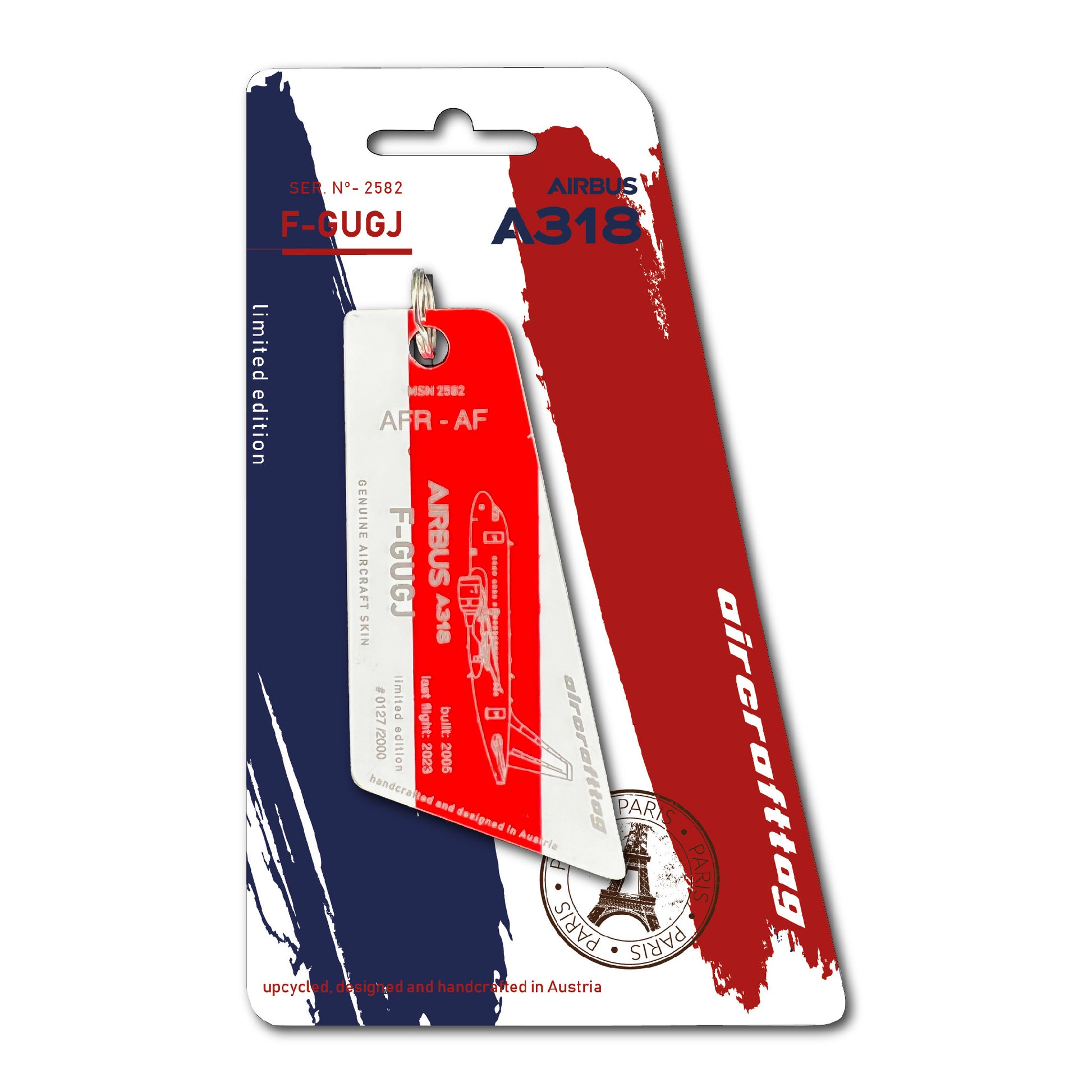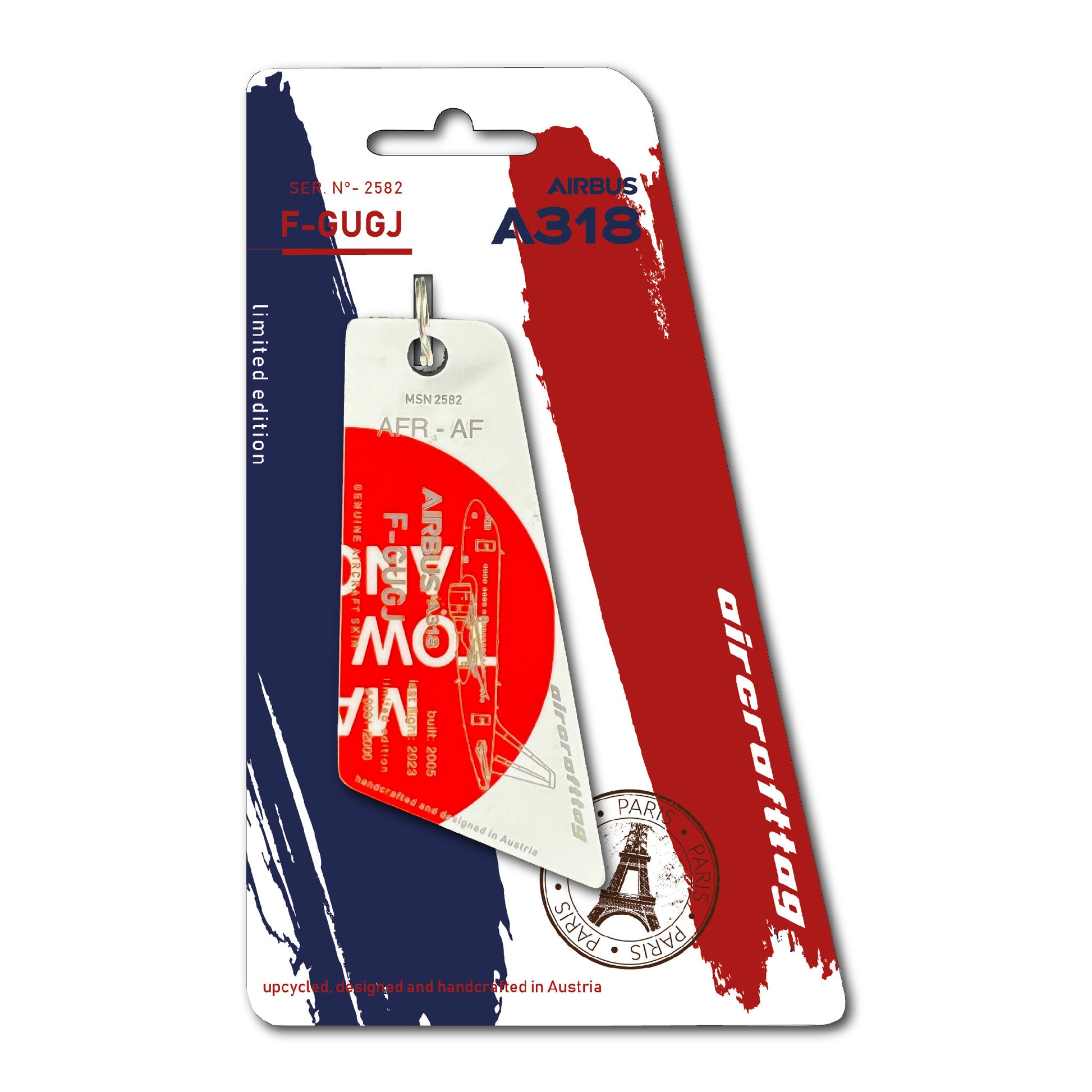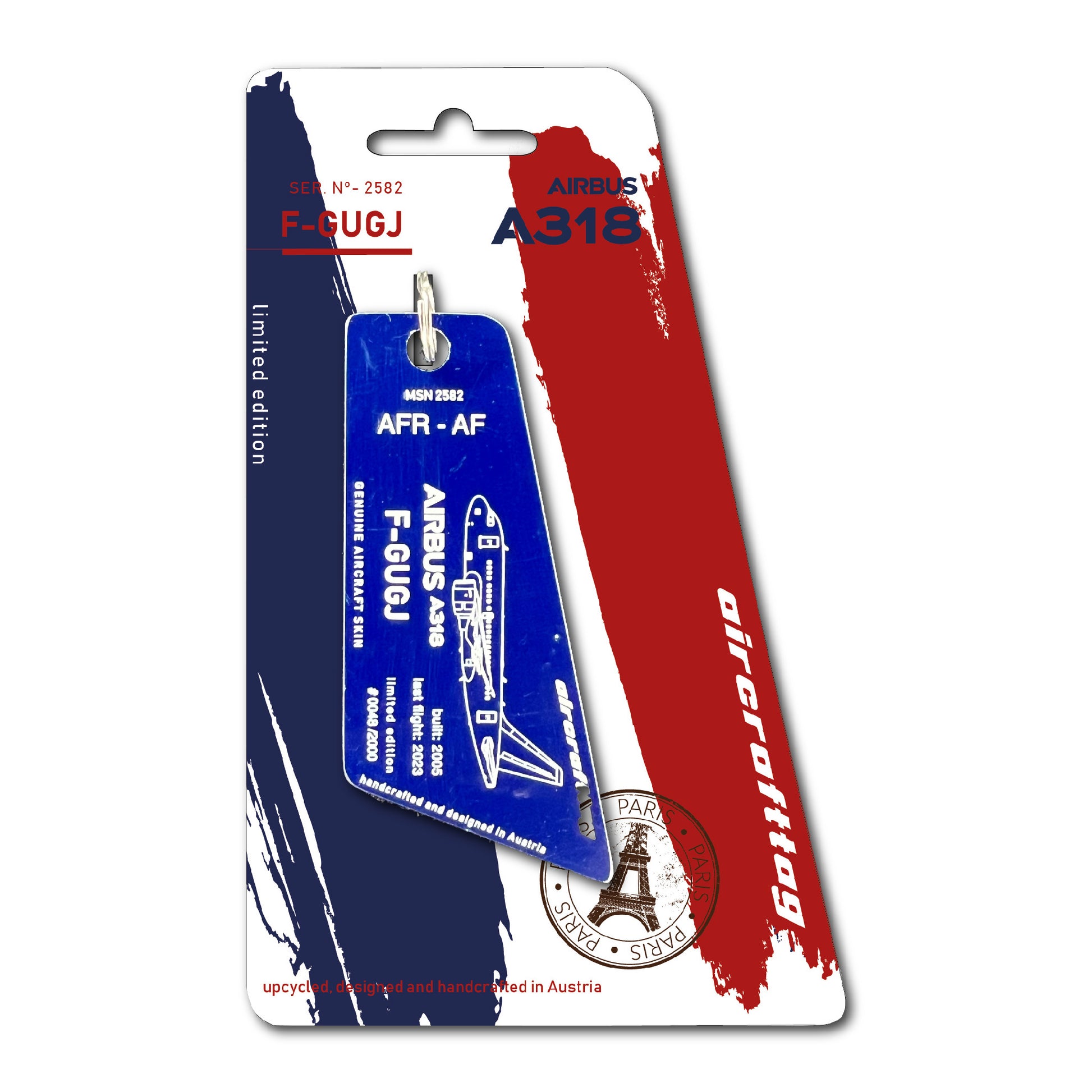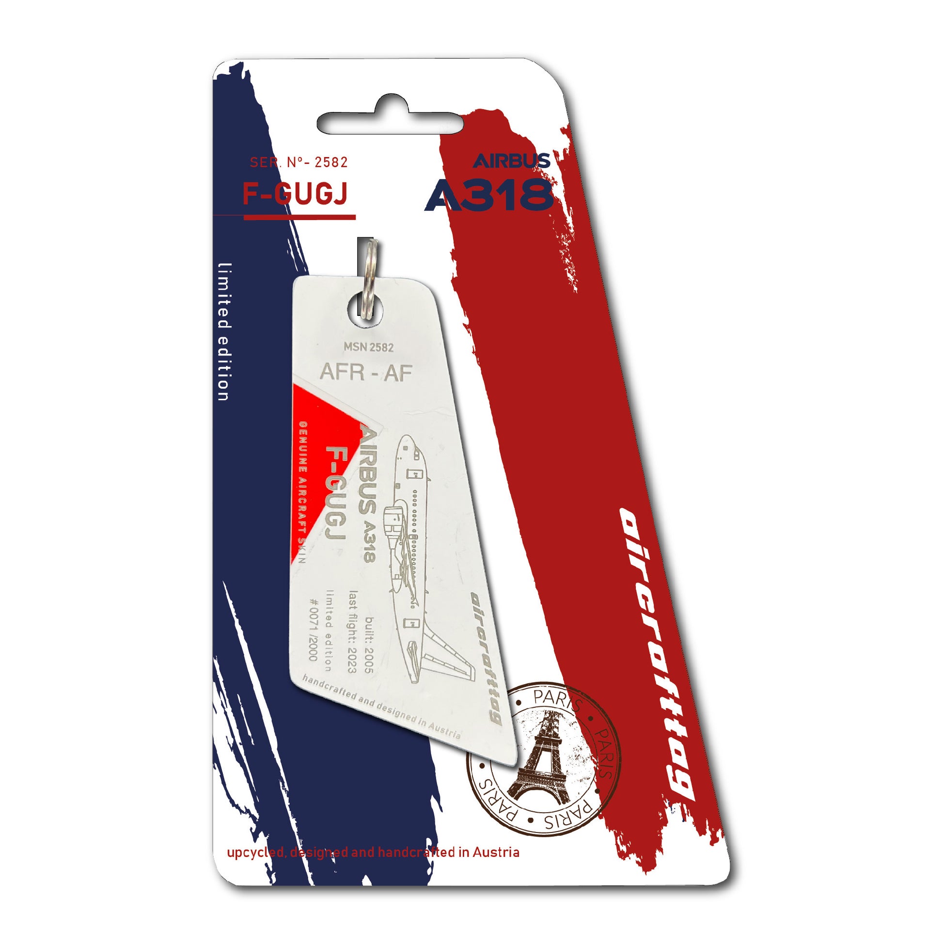 A special feature of the A318 were the small wings on the nosegear, also known as strakes. These were necessary because, in contrast to other Airbus models, the distance from the nose gear to the angel of attack sensors was smaller and the airflow would have disturbed the sensors when the landing gear was extended. These small wings ensured correct readings, especially when flying at high angles of attack. Very special aircrafttags were made from these parts. They are painted on both sides and cannot be personalized.