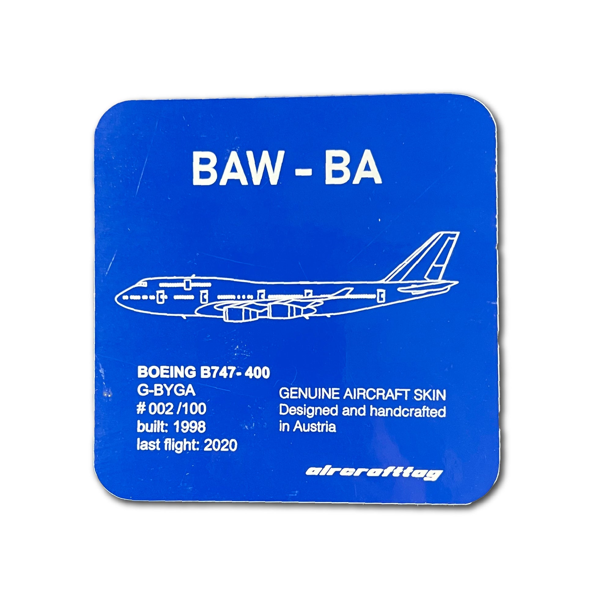 Please be informed, that you order a piece of aviation history. This aircrafttag travelled for more than 2 decades around the world between +40°C and -60°C. This is why you may find dents and scratches on it. As well imperfections of paint may occur.But this is what we want to provide to you.